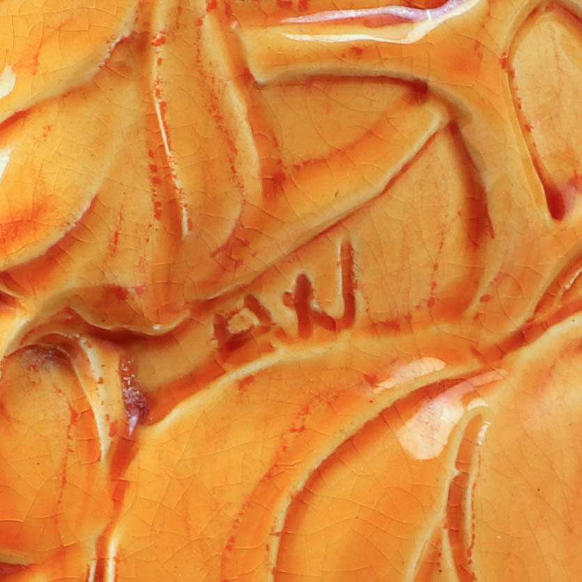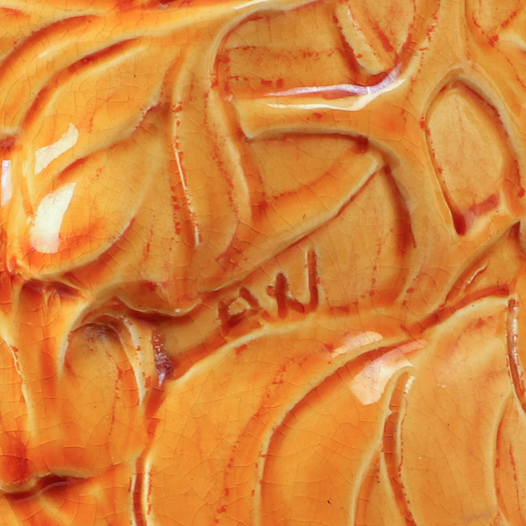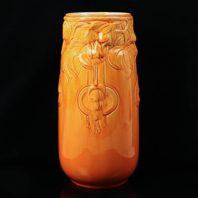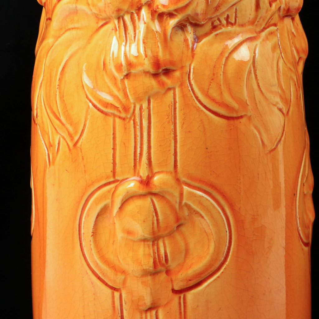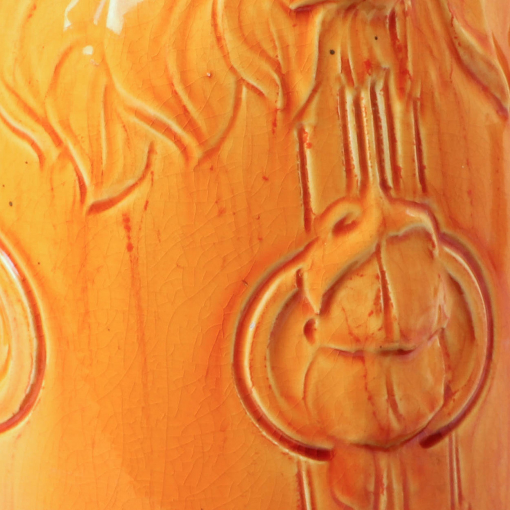Stor vas med reliefdekor samt urangulglasyr. Höjd 29 cm.